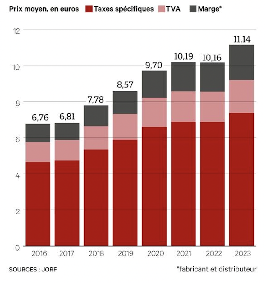 Néanmoins, le socle des 12 millions de fumeurs français ne faiblit pas. Alors, pour lutter contre ce « fléau de santé publique [le ministre souhaite] activer tous les leviers ». Parmi les outils présentés, la hausse du prix du tabac est évidemment utilisée comme levier. 12€ pour un paquet dès 2025 et 13€ courant 2026. La Confédération des buralistes anticipe par conséquent une hausse de 40 centimes du prix des paquets dès janvier 2024.