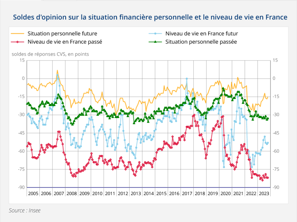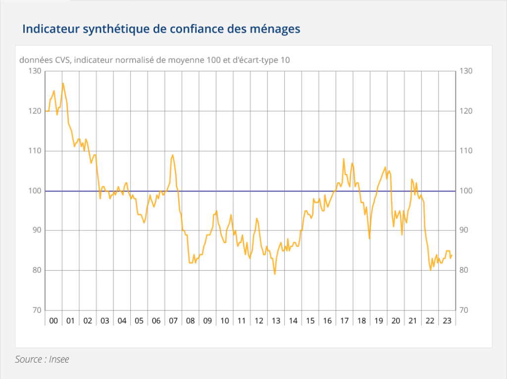 Le 28 novembre 2023, l’Institut national de la statistique publie sa dernière étude sur la confiance des ménages. Cette dernière remonte à 87 points, mais reste bien au-dessous de sa moyenne de 100.