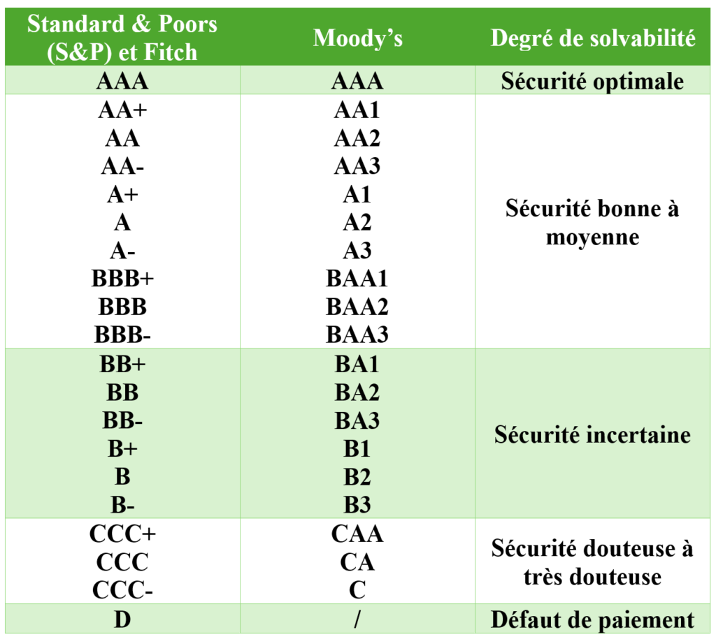 Le fonctionnement de notation d’une agence est propre à chacune. Leurs notes s’établissent entre AAA et D, avec différents degrés intermédiaires (voir ci-dessous). Plus cette note est élevée, plus elle indique que l’institution notée est fiable, et les risques de non-remboursement faibles. Les notes AAA, dites « triple A », correspondent à un emprunteur sans risque, donc disposant d’une bonne solvabilité, les notes B indiquent une solvabilité moyenne, les C, un risque important de non-remboursement… Enfin, la note D correspond à un défaut de paiement, donc à une faillite de l’emprunteur. Aujourd’hui, la note de la France est AA- pour Fitch et AA pour les deux autres agences majeures, qui pourraient s’aligner sur la notation de l’agence Fitch. Cette dernière avait attribué la baisse de AA à AA-, le 28 avril 2023, à la lente dérive des comptes publics français.