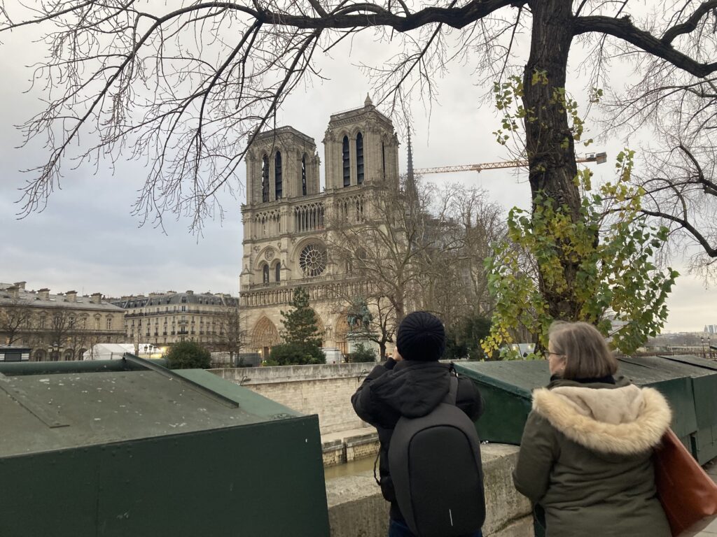 Some tourists taking pictures of the cathedral, on the quay across the Seine. Célia Szymczak for IPJ News.